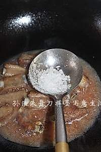 放入盐、冰糖或白糖50克,花椒粉少许,改小火慢炖,如果你觉得你做的排骨颜色不够深,可以滴几滴老抽