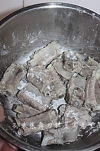 捞出排骨控一下汤,放入盆中撒干淀粉,两手端着盆子上下颠翻,让排骨均匀的粘上薄薄一层干淀粉