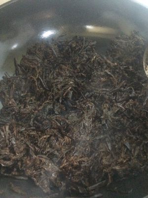 油锅烧热,放入梅干菜煸炒,加入盐炒到颜色发亮盛出,大约五分钟左右。因为浸泡梅干菜中的泥沙时把梅干菜盐份也浸泡走了大半,需要加些盐调味,不然太淡不入味,做这道菜没把握的朋友,可在炒制过程中尝下咸淡,调到自己喜欢的咸度。