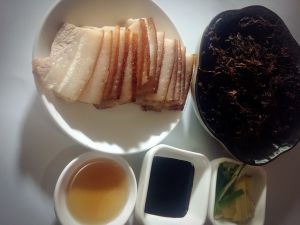 带皮五花肉一整块,要肉厚的,买回来用刀刮一下猪皮。锅里加凉水,加入猪肉,大葱,姜,白酒,煮一个小时。捞出用凉水激一下。