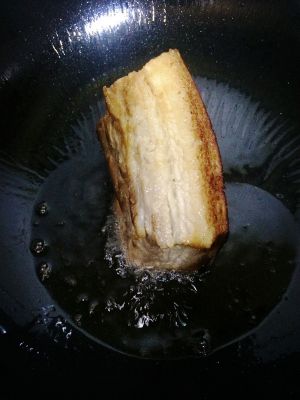 五花肉猪皮向下放入油锅,用锅盖挡着,以免溅到,盖上盖子炸至没有气泡声捞出