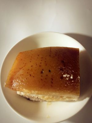 煮熟20分钟后!捞出放一会凉一下!然后锅烧热放少许油,把猪肉的肉皮摸上蜂蜜,油温热把猪皮面朝下煎一下,注,会嘣所以要拿盖子挡一下!煎完凉一下切片,肉皮朝下放在大碗里,放花椒大料大葱姜片,酱油多一些,白糖,鸡精、上锅蒸15分钟出锅,拿盘子把碗里肉倒扣。完成