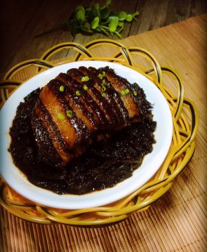 蒸好的梅菜扣肉倒扣在盘子上,刚蒸好很烫,拿个餐布端着碗底防止烫手,超好吃的哦,米饭的好搭档,配面条也很好。