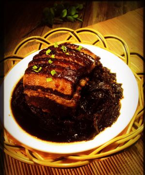 锅内放水支蒸架,梅菜扣肉上扣个盘子,大火烧开后中火蒸一个小时,蒸好的梅菜扣肉放置几个小时后会更入味,喜欢吃更酥软些的,多蒸半个小时,期间看下锅内的水,适时添些水在锅里,别烧干了哦。