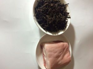 将食材准备好,梅菜、香菇洗净泡温水,五花肉洗净,葱打葱结,红糖、白酒、老抽放入碗中备用
