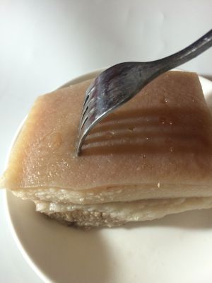 捞出用凉水洗净,肉皮背面用不锈钢叉子叉些洞眼,给肉皮放下油,可以看见肉皮经叉子叉过的地方,冒出了油珠,处理完毕用厨房纸擦干肉皮上的油与水份。