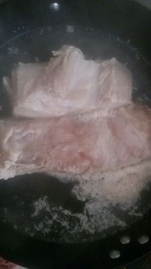 5. 热锅热油,放入煮好沥干的五花肉,把猪皮的一面煎成金黄