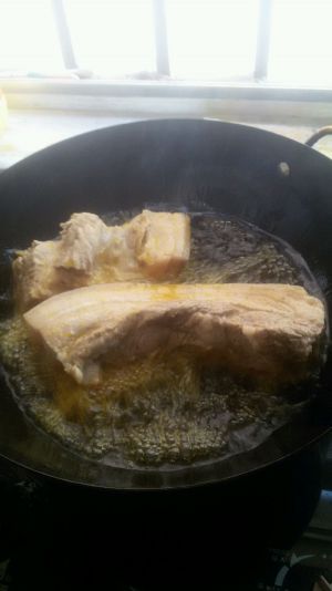 放入五花肉,肉皮朝下炸至表面金黄起泡,翻面再炸一会儿,炸的时候可以盖上锅盖,防止被油爆到,炸至四周都上色的程度,即可捞出;