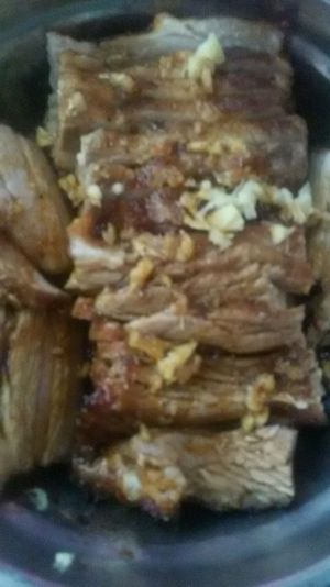五花肉块凉透表面干了, 抹蜂蜜或老抽到67成热的油锅里去炸, 盖上锅盖子, 以防工伤啊! 这样最后成品是虎皮状态。 再取出凉透,切成薄厚一样的厚度, 把皮朝下放一个盆或大碗里; 加葱姜片, 生抽2老抽1的比例; 加冰糖少许;最后平铺盖上梅干菜…… 上蒸笼大火蒸50分钟左右。