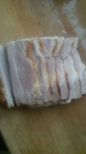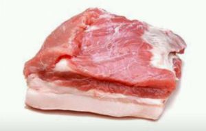 7. 取出五花肉,将其切成1厘米左右的肉片。