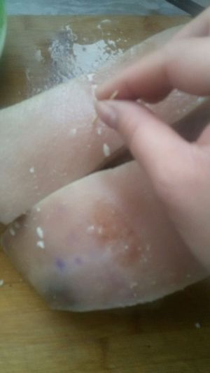 放在案板上,用牙签再皮上扎些小洞,然后均匀的抹上米酒,过两分钟再抹上一层,反复抹上三四次