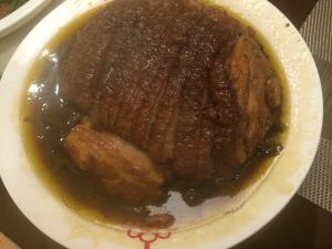 取出蒸的盆或大碗倒出汁水, 用盘子盖在盆或碗上, 倒扣, 这样梅干菜在盘底, 酥烂的虎皮五花肉的肉皮在上。 汁水直接浇上去, 或取一小奶锅中加入湿芡粉勾芡, 尝尝咸淡再浇汁!