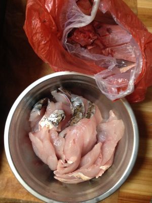 市场直接买来的草鱼,可叫鱼老板帮忙片好,鱼片鱼骨分开,就不用自己动手咯。(偷懒~)