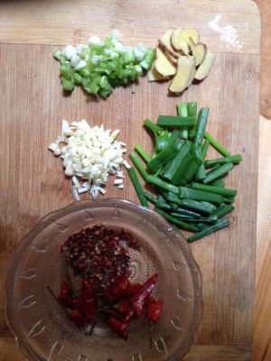 趁腌鱼的时间备好料。葱白、蒜切末,干辣椒去籽、姜切片或丝。
