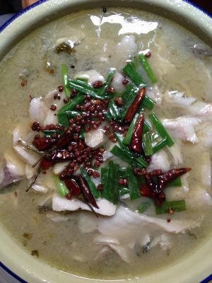 最后,用小火把干辣椒和花椒炒香倒到鱼上,再下油加热到冒青烟,淋到鱼上,伴随着滋滋生,美味的酸菜鱼就做好了,趁热享受吧。