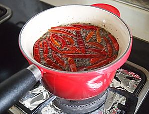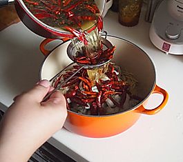 把余下的花椒和麻椒,放在之前煮好的五香油里,油温8成热的时候再加入余下的干辣椒。