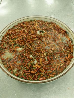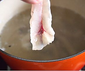 锅里加水,烧开,关火,这一部只是为鱼定型,鱼片是要二份熟的,江团可以在锅里呆四到六秒,如果是草鱼下锅以后,稍微定型马上捞出,这个时候煮鱼的汤不要着急到,锅里面加入辣椒,煮开。再用清水泡一下花椒麻椒。因为鱼肉是很嫩的。捞出撒葱花加麻椒油。