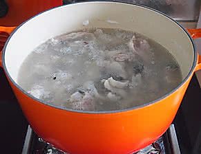 放入鱼头和鱼骨翻炒片刻,加入清水大火煮开后,小火熬煮十分钟。