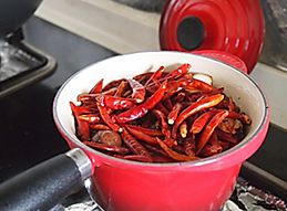 转小火,再放入一半的干辣椒继续加热3-5分钟。