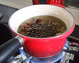 锅内倒油,将豆瓣酱、干辣椒、花椒、姜片和蒜瓣放入锅内炒出红油爆香,加少量水煮开