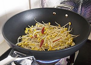 锅中加少许底油,放入5个干辣椒炒香锅底,放入黄豆芽,加盐炒熟,放入容器底部。