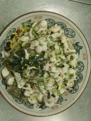 煮好的鱼连汤带肉倒入铺有豆芽的大碗里,撒上辣椒面和花椒粉,再放上葱丝。