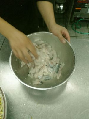 片鱼的照片被我搞丢了,只能告诉大家片成单个的鱼片(也可以片成蝴蝶片)鱼片冲水洗净,放入足够的盐味,少许胡椒粉,白酒。盐味稍微重点,浇油的时候会把盐味冲淡的。码鱼的时候可以用手尝一下。盐味足够再加红薯粉,(也可以加蛋清,和生粉)
