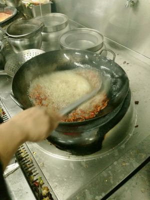 花椒和尖椒变色后,放入葱姜蒜煸炒出香味,放入豆瓣酱炒出红油。