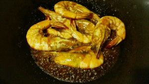 锅内放入油,放辣椒丝,葱蒜,放入大虾,炒至虾两面变色,放入少许糖,醋。然后倒入炒菜酱油,待汤汁收好,就可以出锅了,可以放上少许香菜。