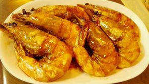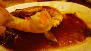 将汤汁淋在虾上