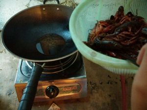 锅里放些油,然后把那些葱姜辣椒放进去炒香,然后把刚才炒过的虾再倒回锅里,继续翻炒一会儿