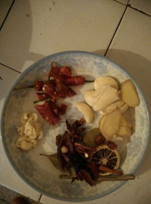 油七分热,冒一点泡泡就放入葱(大料花椒一起放省事),爆香。