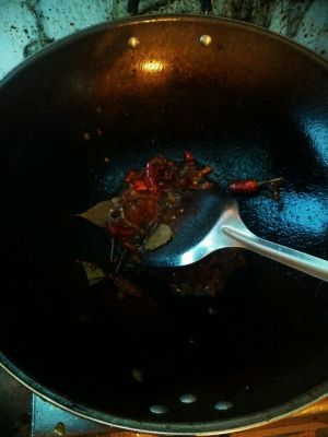 烧热油锅加入香料豆瓣酱辣椒香料爆香