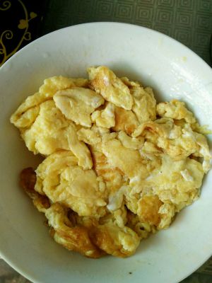 将油烧热,鸡蛋入锅翻炒熟,然后盛出待用