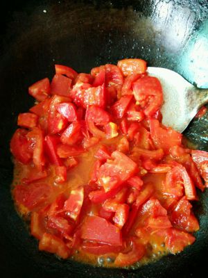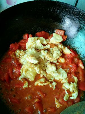 将西红柿切成滚刀块,用刚刚炒鸡蛋时锅里残余的油将西红柿炒出汁水,过程中放入半勺盐有利于汁水渗出,炒出红色汤汁后将鸡蛋倒入,加入糖,翻炒,用铲子按压鸡蛋入味