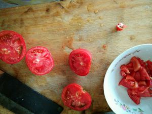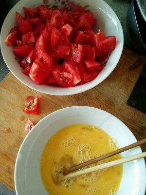 西红柿切小块。依个人喜好。个人喜欢把西红柿炒化了,汤浓浓的,所以切的块较小。