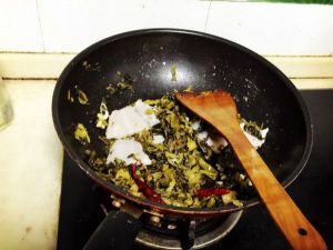 放入酸菜包,放入鱼排鱼骨鱼头与之同炒。放入几颗干辣椒