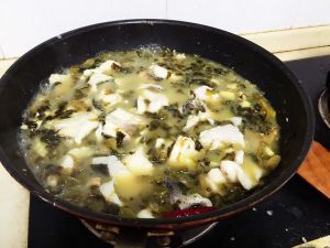 水煮沸后,将鱼片和酸菜倒入锅中撒入盐,煮20分钟