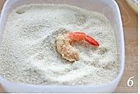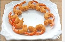 再将挂好浆的虾肉放入面包糠中均匀的裹上一层面包糠;