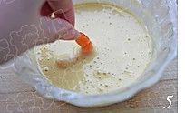 将虾肉下入蛋糊中挂浆,注意尾部不要挂;