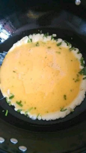 热锅倒入较多的油,调小火倒入蛋液,蛋液凝固快速切块