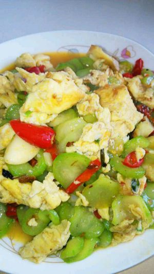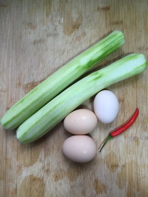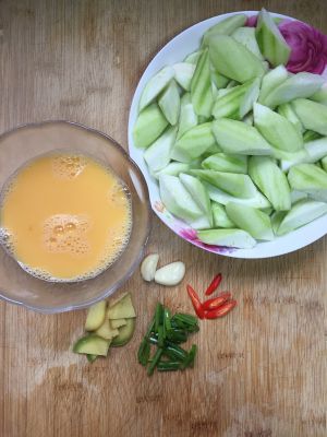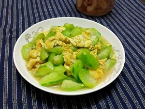 另起锅放油,放蒜爆香,倒入丝瓜,炒稍微变软就加入鸡蛋,放一点清水,加点酱油翻炒一下,收汁就可以起锅了。