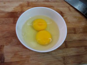 鸡蛋打入碗中加2匙水(使蛋松软不糊锅),半匙白酒(去蛋腥),加入少许盐打撒