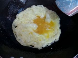 炒锅烧热,倒入适量植物油;将蛋液倒进锅里,凝固后捣散;