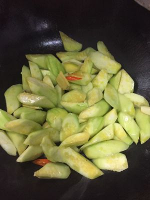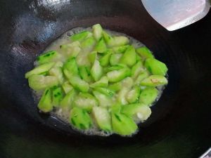 翻炒过程中,因为丝瓜本身有些粘液会导致糊锅,可以适当的洒水不让其糊锅,炒到丝瓜半软,加入半碗水焖至水八成干