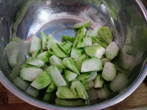 八角丝瓜刮去硬皮洗净切滚刀块(与蛋炒切小一些)