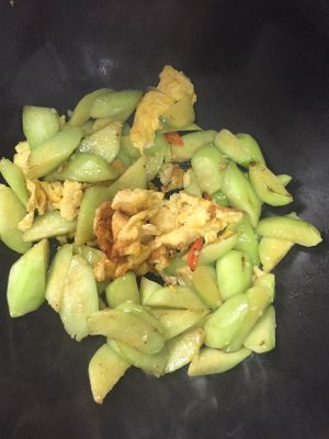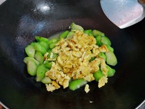 丝瓜炒软后,放入鸡蛋块翻炒;
