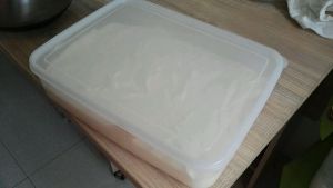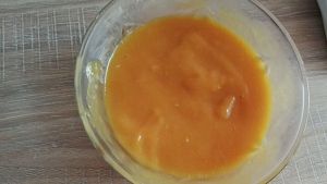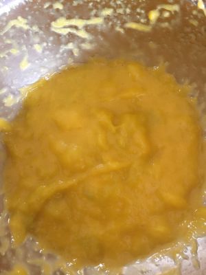 芒果泥加入蛋奶液中搅匀,再加入淡奶油,搅匀就成了冰淇淋糊。
