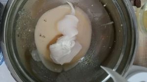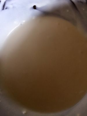 蛋黄打散加入牛奶,糖,煮一下,不要煮沸
