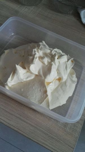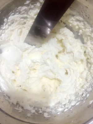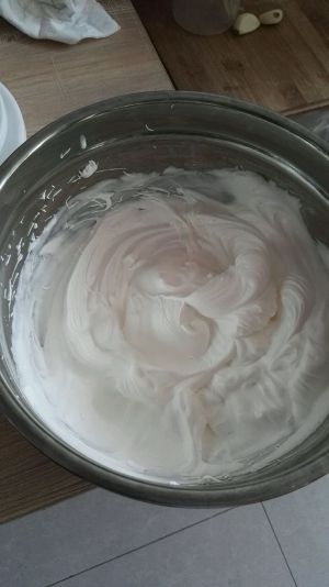 将鲜奶油隔冰水,用电动打蛋器高速档打至7成发,大约是原体积的1.5倍。打发好的鲜奶油放冰箱冷藏备用